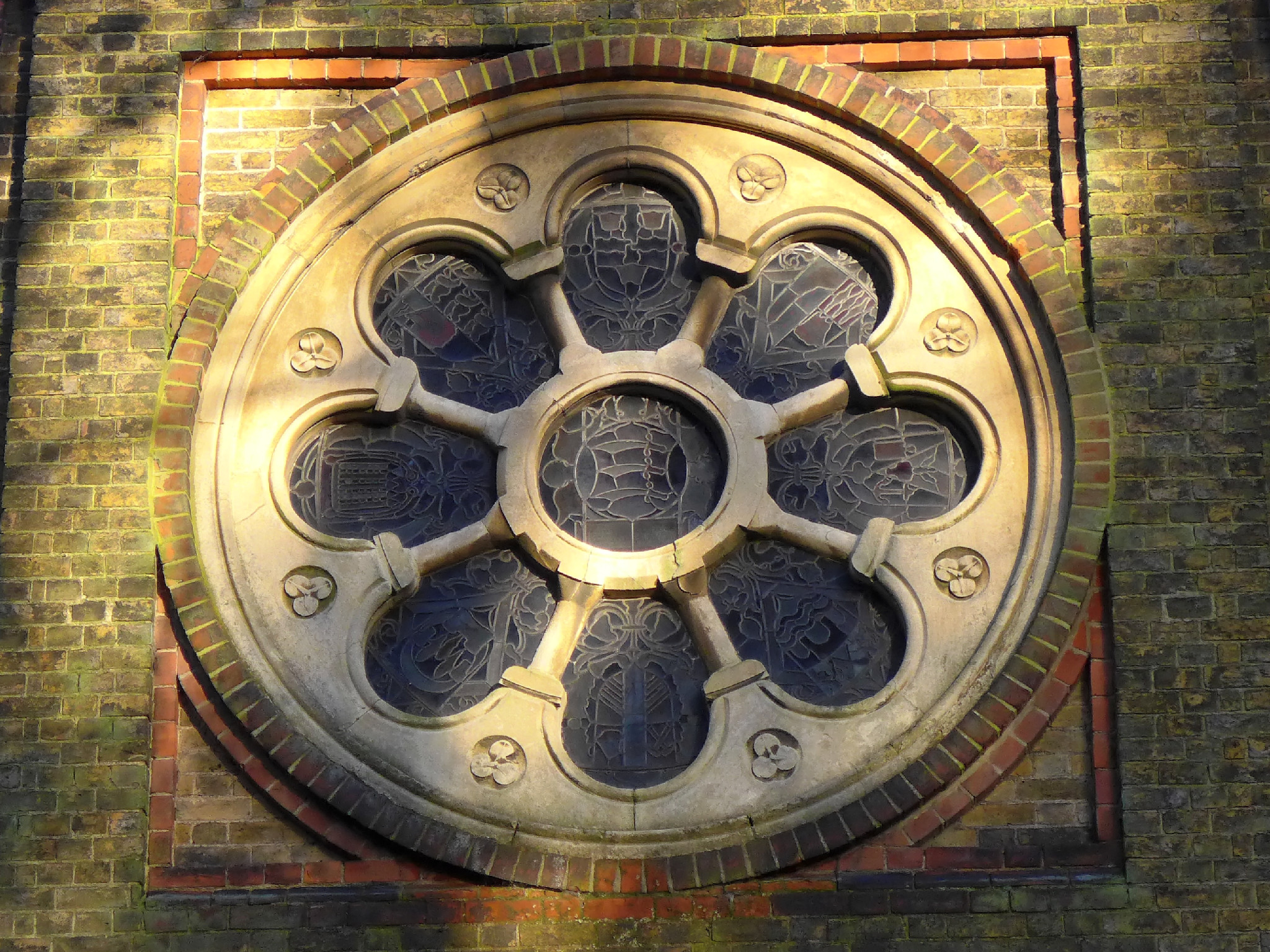 The rose window above the main entrance door. In the centre are three Saxon seax knives,which is the logo of Essex County Council.