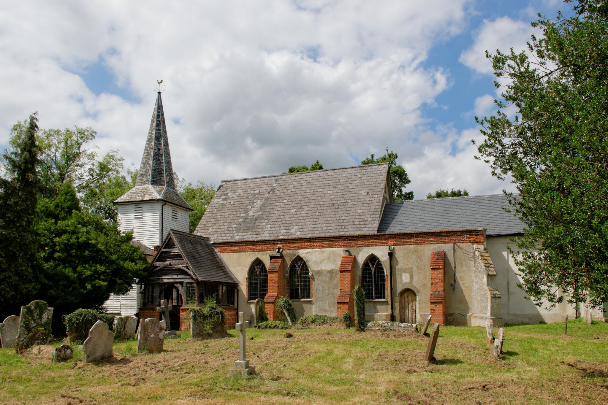 The church has a Norman nave, the remains of a 13th century chancel. The south arcade and south aisle were added in the 14th century. The current chancel was built in the early 16th century. The timber porch was built in 1500 and has a crown post roof. The timber framed cruciform tower was built in the 14th century. The tower construction is unusual, with arched braces in all four directions, buttressing struts in the arms of the cross, and in the upper floor arched braces like ribs meet at a central boss carved with a grotesque face.