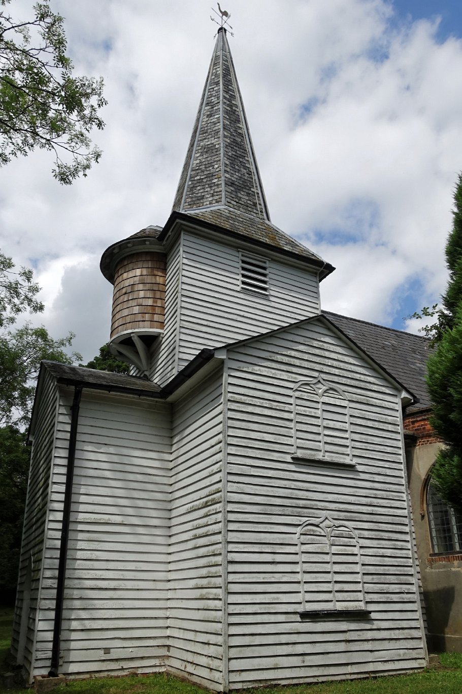 The 14th century timber tower stands against the west wall of the south aisle. It was built to a cruciform shape at ground level (each arm is independently gabled), with a square bell tower and an octagonal spire. The tower was originally covered in wattle and daub but is now weatherboarded. There are two Gothic windows on the south side of the ground floor, and an oriel was built into the upper section in the 17th century to accommodate a larger peal of bells.