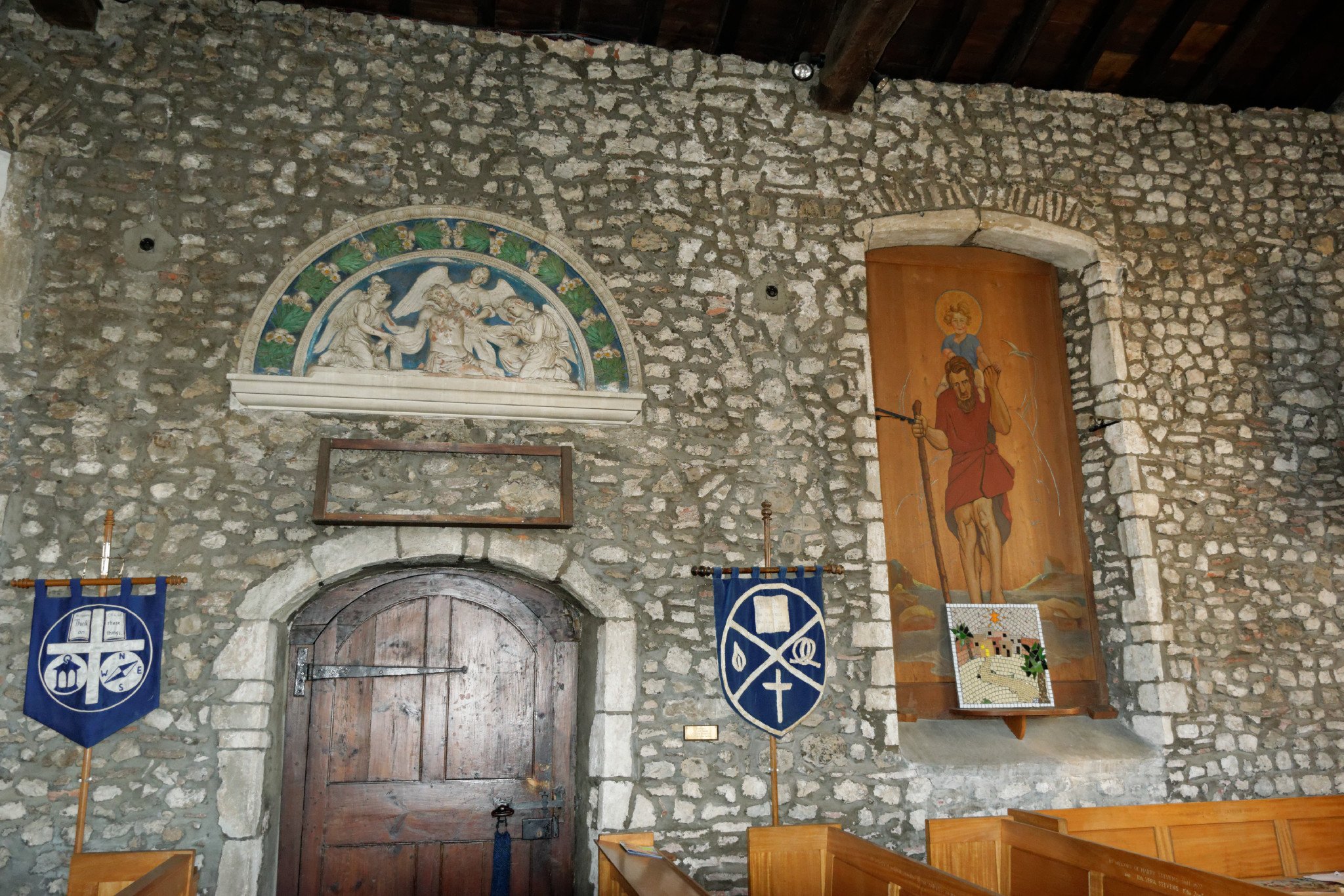 The photo shows the wall of the South Aisle, constructed in the 15th century and extended with Tudor roof in the 15th century. The recently re-pointed south wall, rebuilt in 1833, is incongruous with the rest of of the church interior. To the right of the door over the small brass plate, is a small Saxon carving. It is not clear how it got into a wall originating in the 15th century. Above the door is a lunette of Christ and the Angels in the style of a Rennaissance Florentine sculpture, dated 1907. Below, a wooden frame with no apparent purpose. On the right, a window is boarded up by a painting of St Christoper presented to the church in 1939. Obscuring it is a modern mosaic perched on a specially built shelf. To the left (out of shot) is an aluminium ladder wedged between the pews and wall, right next to the 15th century piscina.