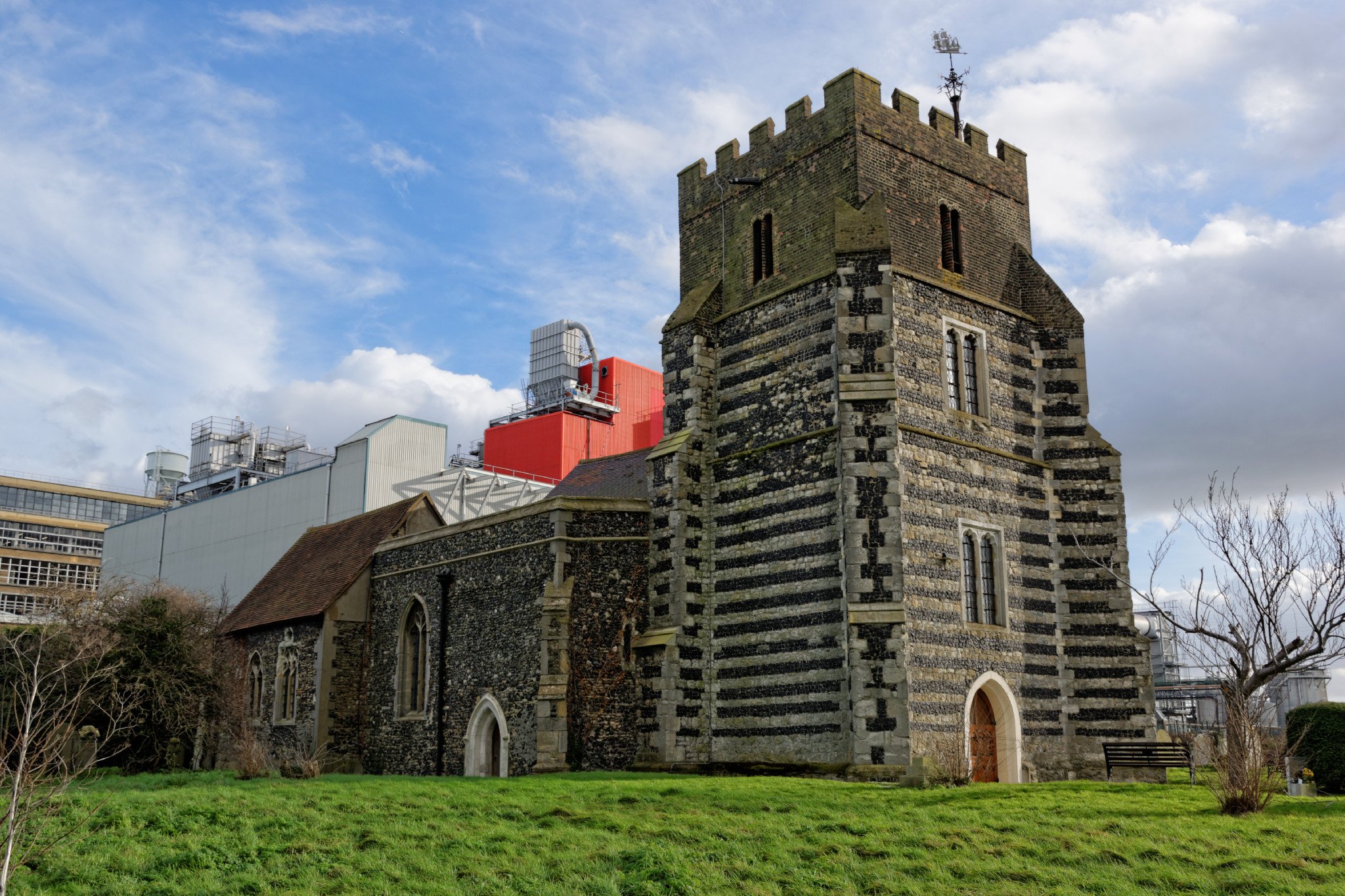 Grade I listed church preserved by Proctor & Gamble whose factory looms behind the church. It stood alone on the Thames side marshes until recent industrialisation. The 12th century church had a round tower which doubled as a round nave.The chancel was later enlarged and the round tower replaced with a larger west tower in the 15th century.