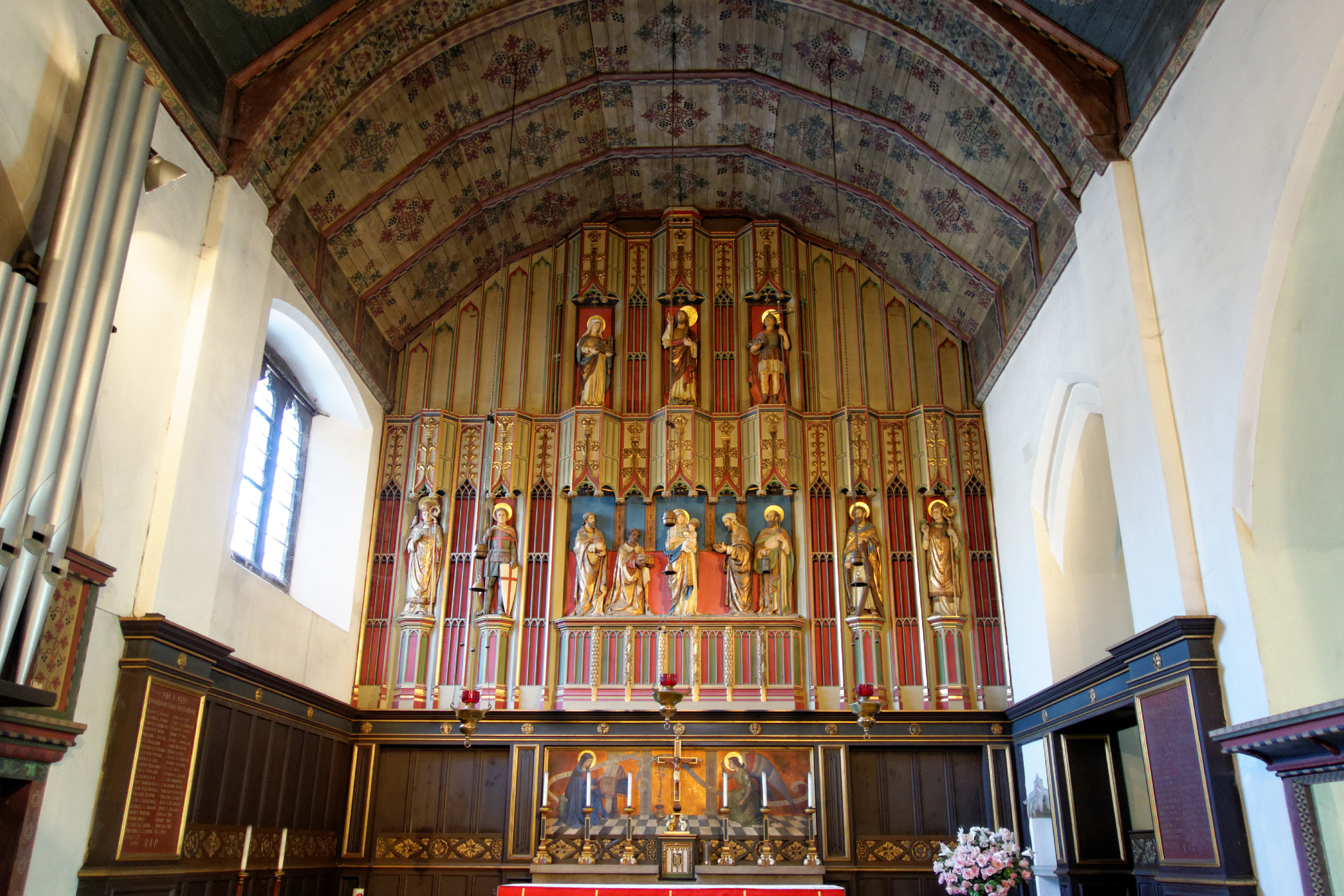 Beneath the painted ceiling, the entire east wall of the chancel displays two tiers of figures in canopied niches. The central Nativity scene is flanked by the four patron saints of the British Isles. Behind the high altar the dark panelling serves as a backdrop to a striking picture of the Annunciation.