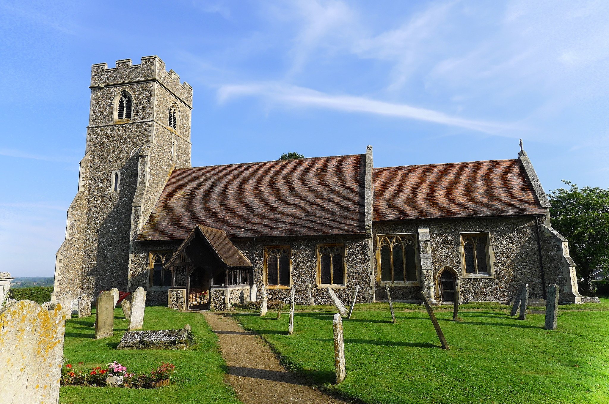 The walls of the church are of flint-rubble mixed with some fragments of freestone and Roman brick; the roofs are tiled. The chancel and nave were built c.1360–70, probably on the site of an earlier church. About the middle of the 15th century the tower and porch were added. The church was restored in the 19th century, when the north aisle was added and the tower and porch largely re-built.