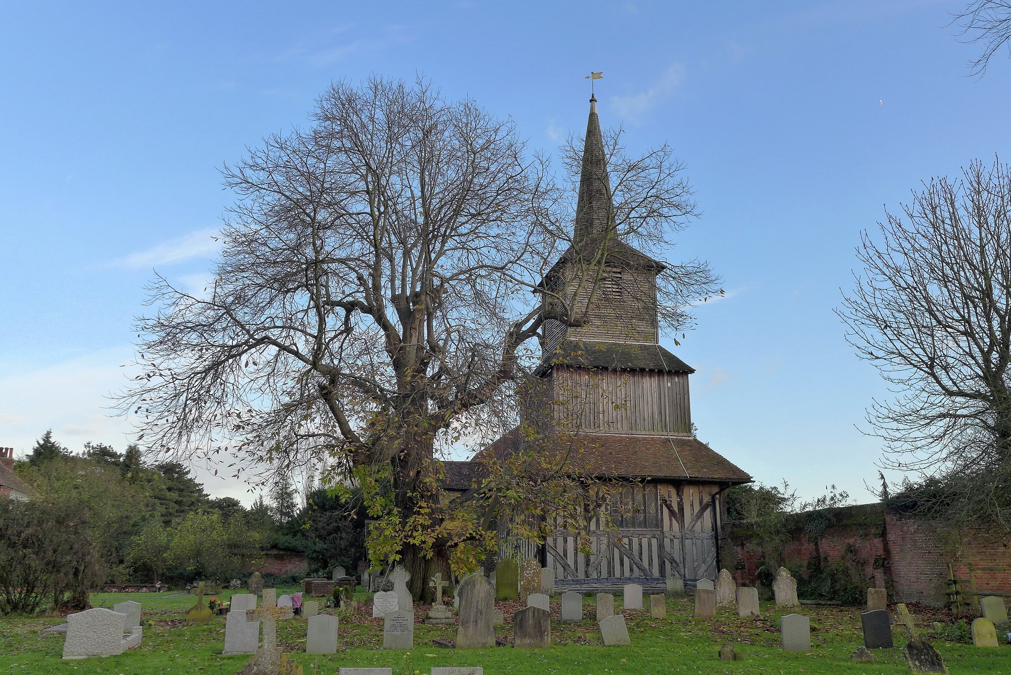Norman, from 1170, with many 12th century features remaining. The wooden bell tower was built c. 1400, and is the largest in Essex. The original medieval timber remains. The tower rises in three stages - unlike any other wooden tower in Essex. Front view:Blackmore - Priory Church of St Laurence: Frontview North door: North door