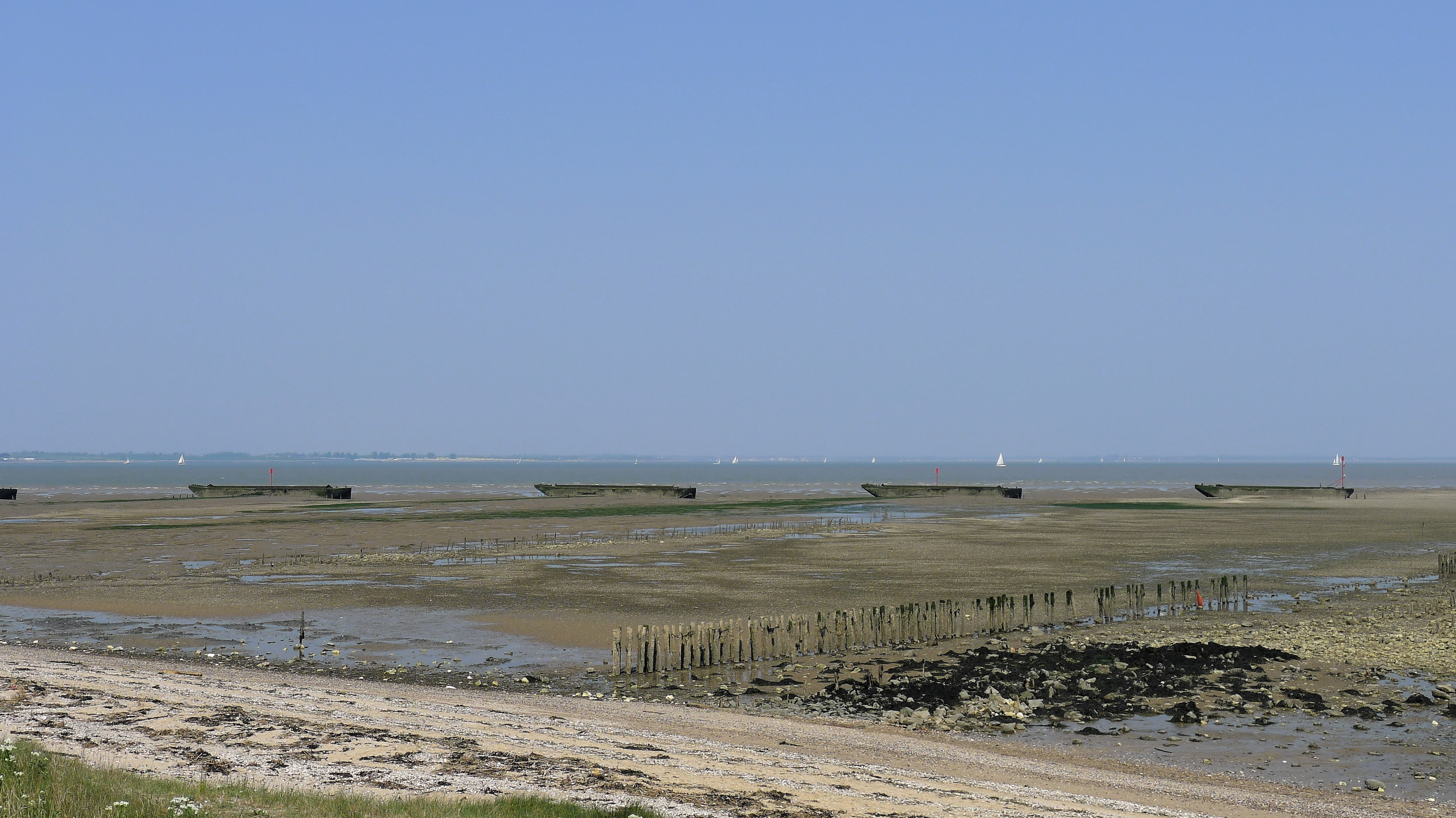 A row of barges sunk offshore on the north-east of the Dengie Peninsula to protect the saltmarsh and seawall from erosion.