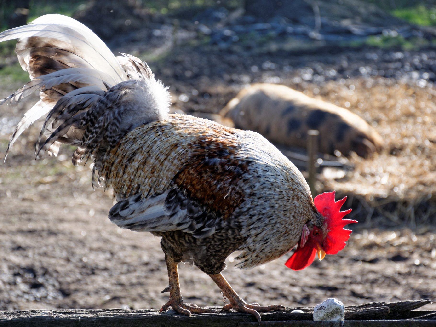 In the background, there is a traditional rare breed pig, the Oxford Sandy and Black, basking in the sunshine. The breed was saved from near extinction about 20 years ago.