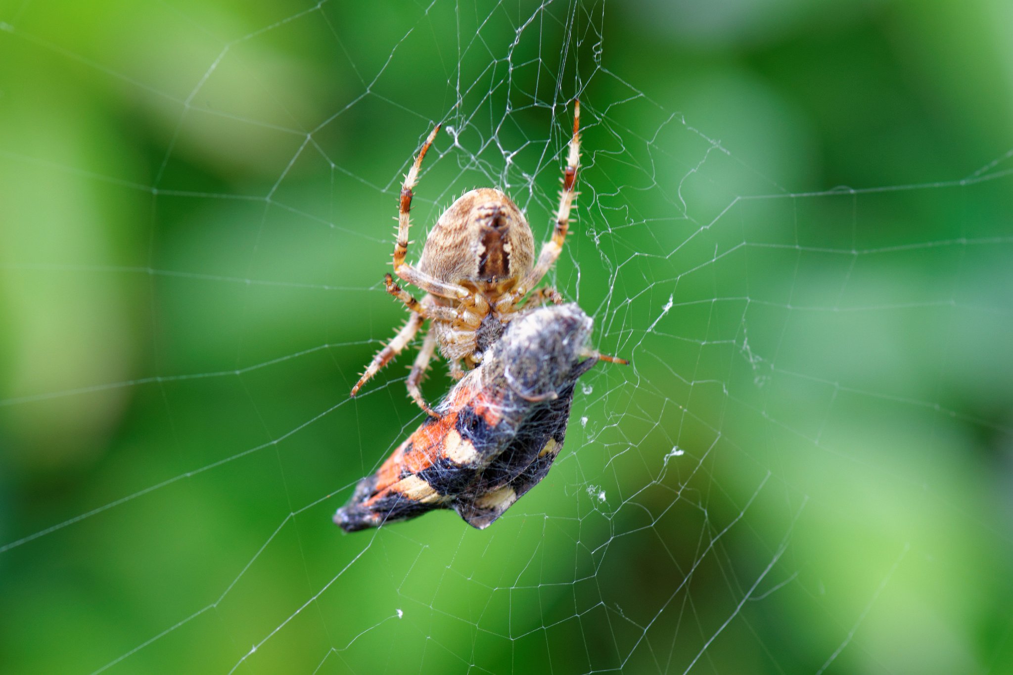 Garden or Cross Spider (Araneus diadematus) with moth snack - possibly Elephant Hawk Moth.