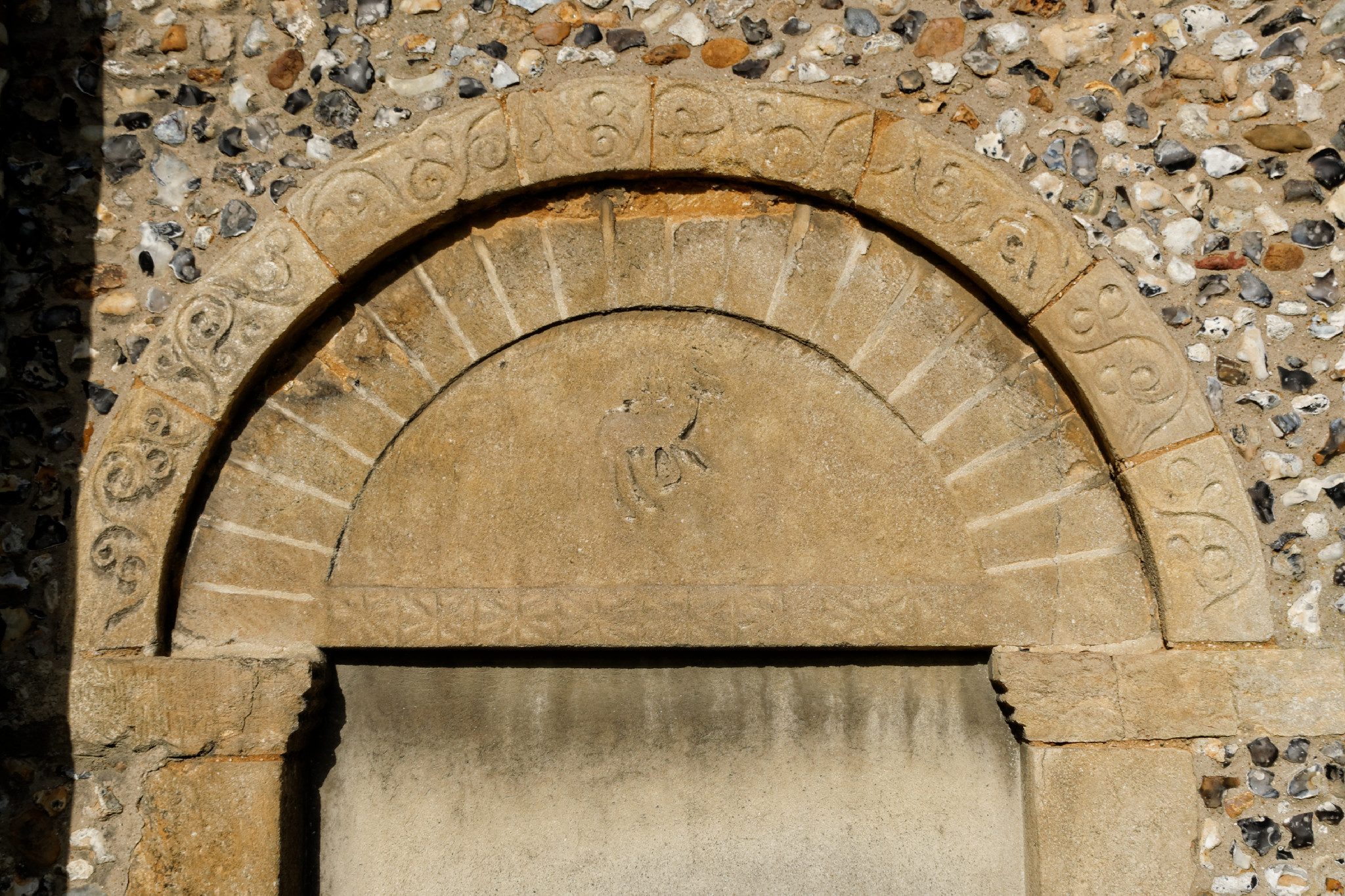 This beautifully carved Norman arch has, in the centre of the tympanum, a crude carving of a lamb. This is the only example of a figure carved into the tympanum in the whole of Essex, although the custom is quite common in other counties.
