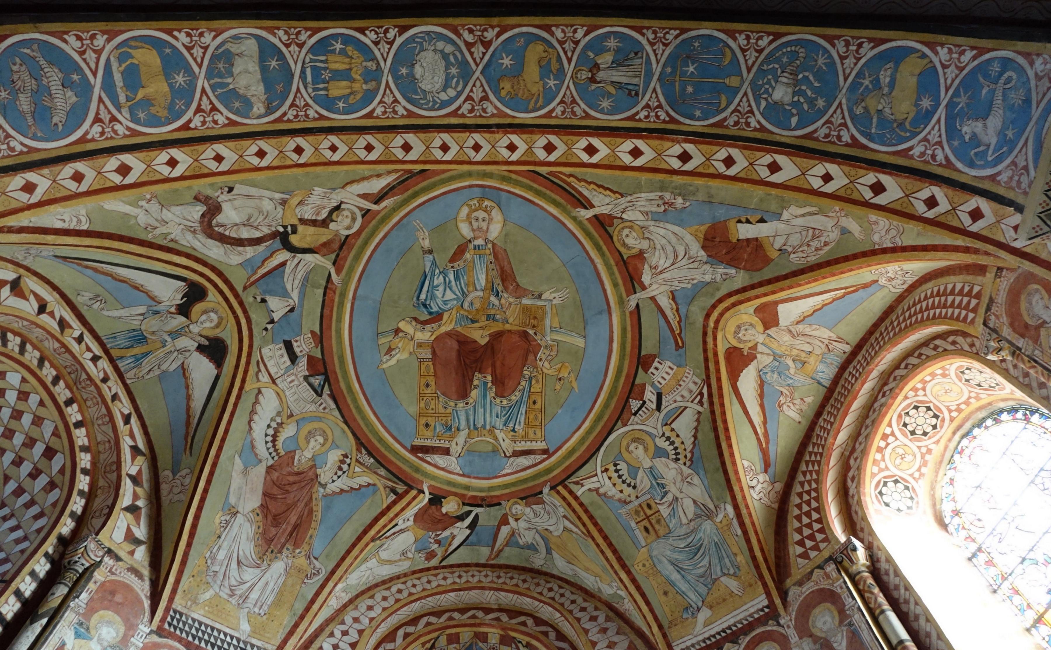 Every inch of the apse ceiling is painted in vivid colours. These were applied in 1872 as part of a restoration. The colours are intensly vibrant. The geometric designs aound the windows echo those painted nine hundred years ago in the nave. The figurative paintings and signs of the zodiac feel more modern.