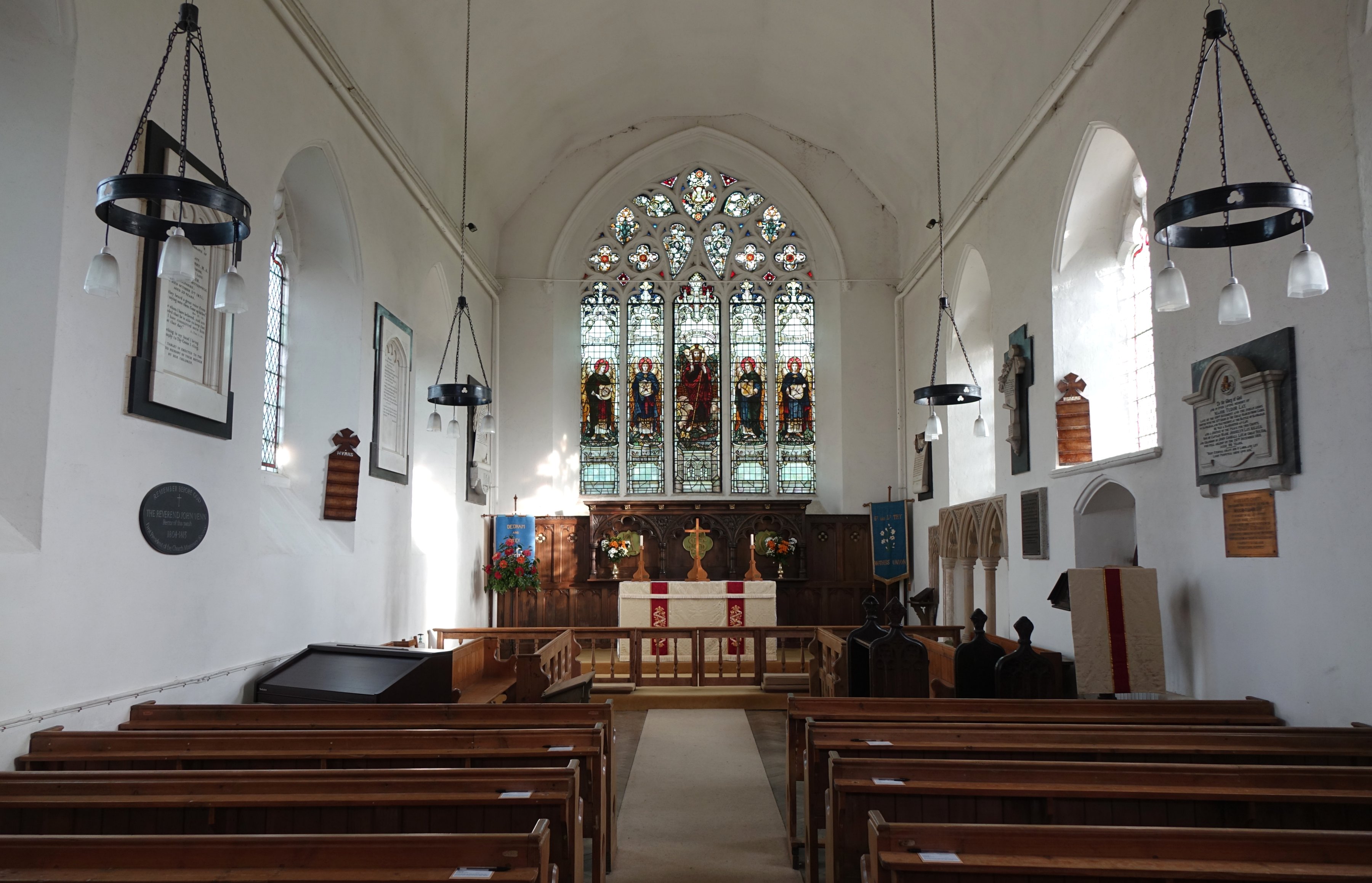 The 14th century chancel is plain and austere. All the focus is on the altar and the huge east window, which takes up almost the whole of the east wall. The church was restored in 1896 and re-opened in 1902 with new furnishings including reredos and stained glass. The two small pews beside the lectern are 15th century, with poppyhead benchends and traceried panels.