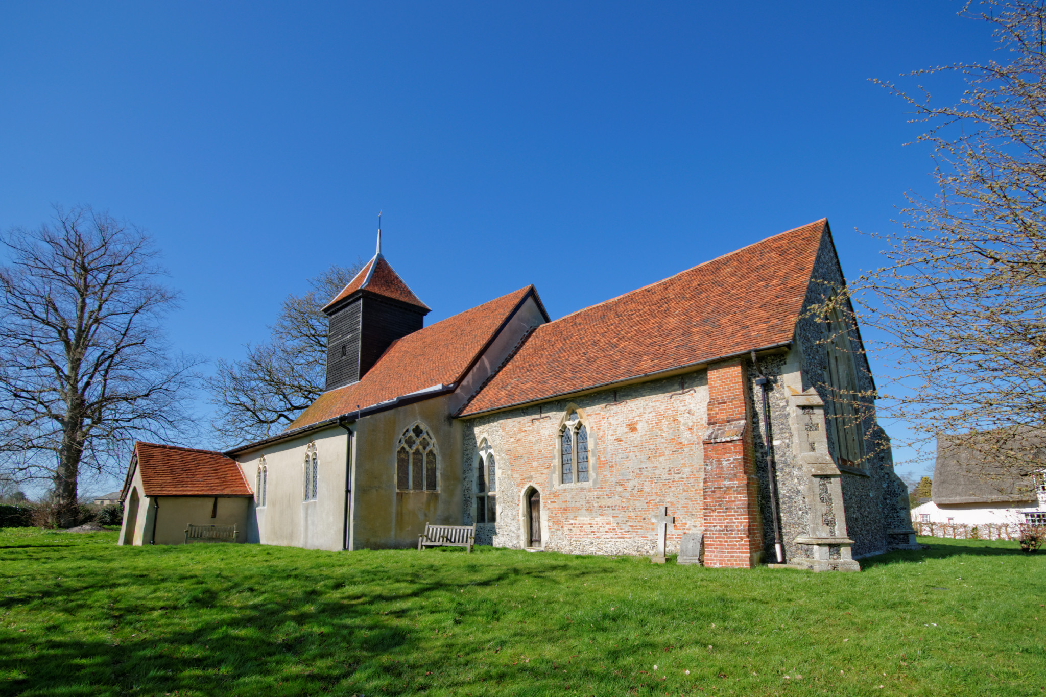 St Barnabas is built on the site of a Bronze-age burial earthwork. The nave is possibly pre-Norman (ie Anglo-Saxon): the 880mm thick walls are built of stone and flint, with two sarsen stones incorporated in the west wall. Despite stone being in short supply in Essex, there are other quite large stones in the churchyard which have been left, and this has led to speculation that they may have been part of an earlier megalithic stone circle. Certainly, the building of the church over a pagan site seems to have been an attempt to Christianise an ancient sacred place.