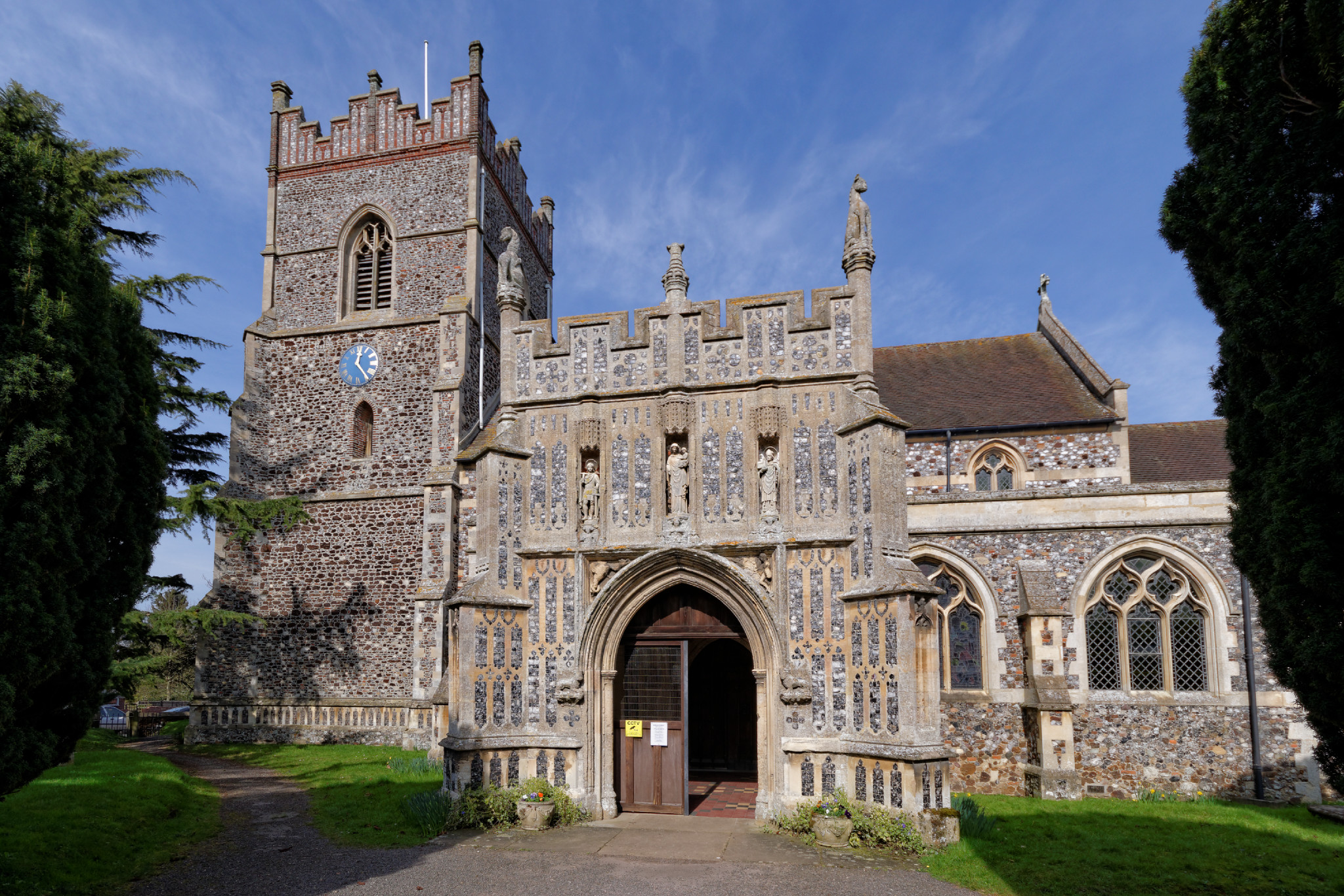 The tower and west porch are 15th century - the remainder of the church was rebuilt in 1882 by the Victorian architect Butterworth, who also added pinnacles to the tower. The porch is decorated with stone panels and traceries heads, with carvings of St George and the Dragon, and topped with embattled parapet guarded by lions.