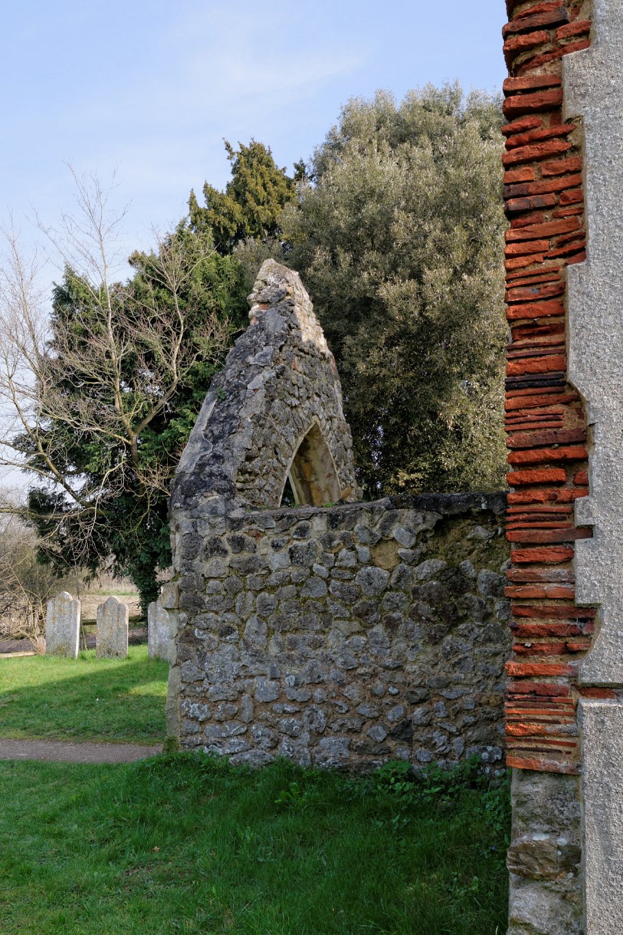 The north porch is a 19th century addition. In the foreground is part of the Norman west wall, built largely from Roman bricks taken from a villa about half a mile south of the church.