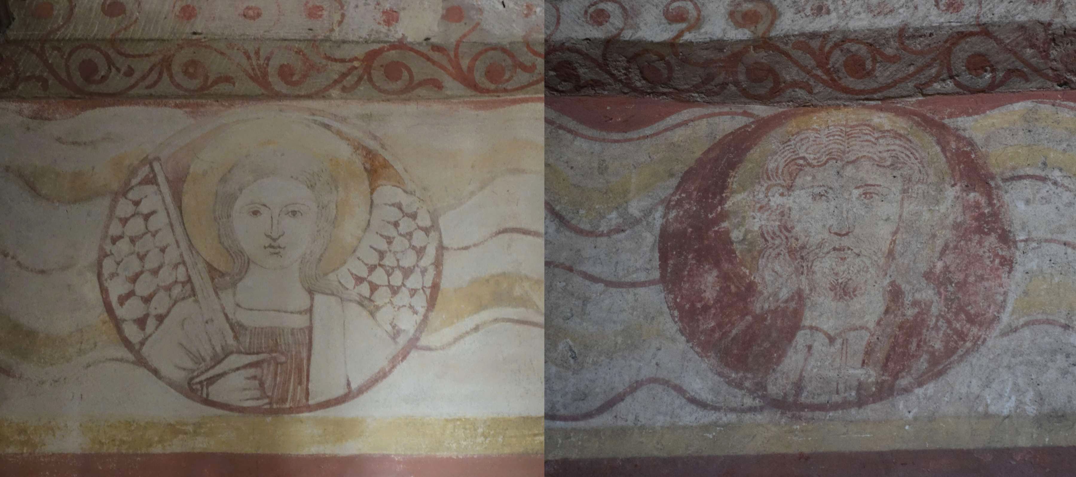 Below each of the springers is a representation of a religious figure. These appear to be Gabriel on the left, and Christ on the right.