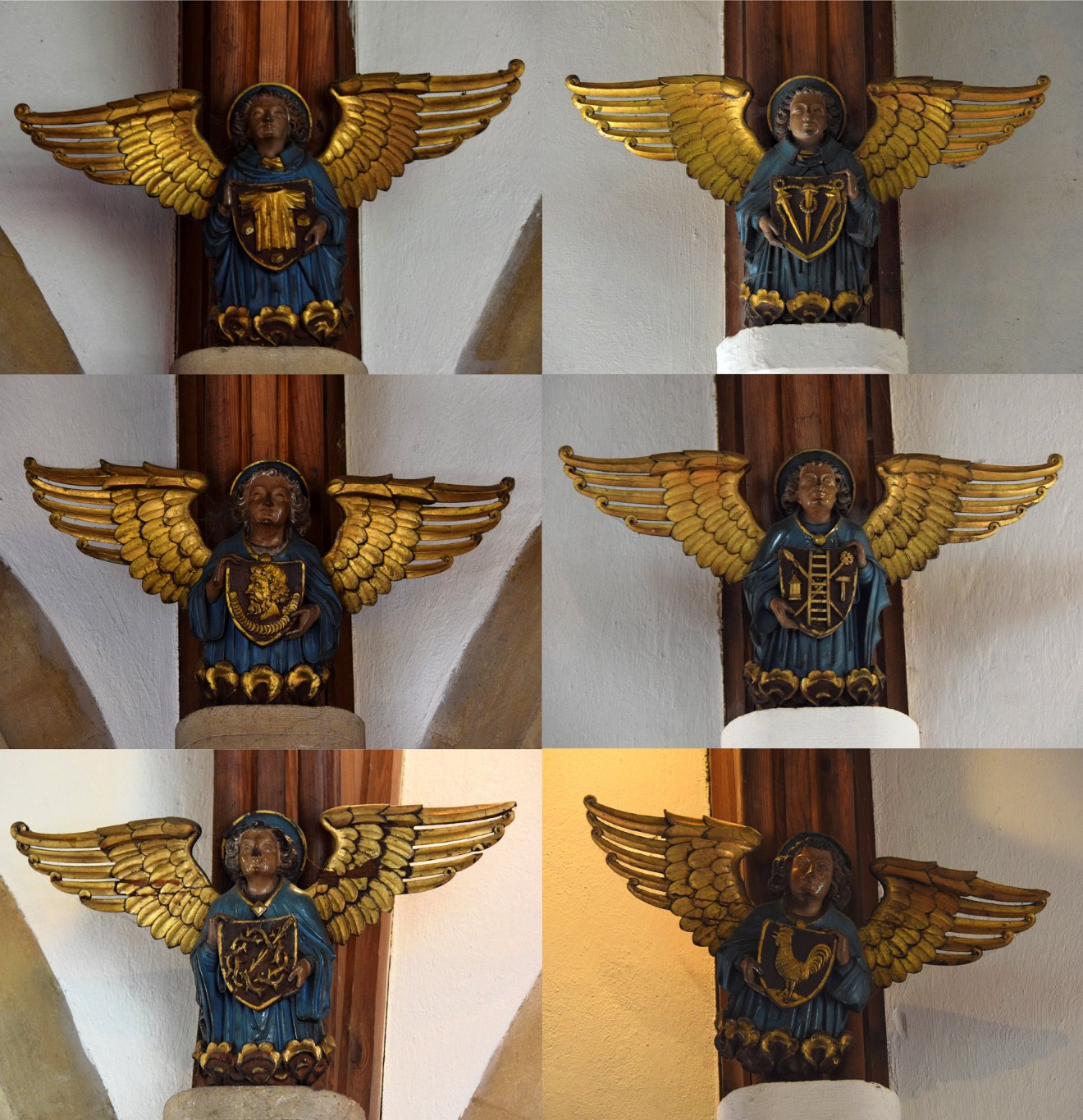 The roof timbers of the South Aisle have been decorated with painted and gilded angels. These were brought from St Andrews Church, Plaistow in east London when it closed. There are three similar angels from Plaistow mounted on the Chancel roof timbers. There are now no angels left in Plaistow.