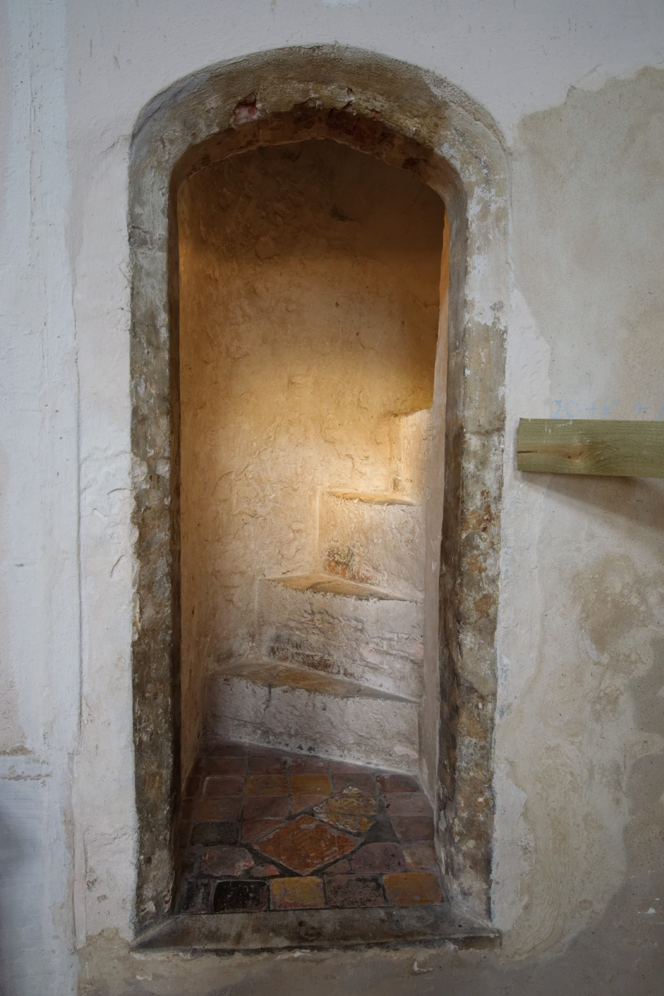 Set into the thickness of the wall are early 16th century rood stairs, with the original medieval heraldic tiles at the base.